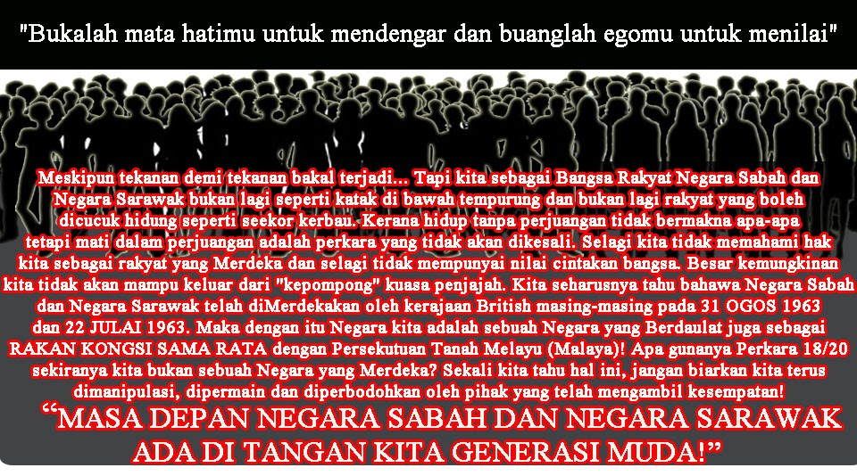 Sila luangkan masa anda untuk memahami mesej ini... Jangan jadikan diri anda seperti tunggul kayu yang hanya membiarkan diri dihempas ombak penindasan dan penganiayaan. Anda semua adalah harapan Bangsa Negara Sabah dan Negara Sarawak yang harus serta mesti mempunyai kapasiti diri untuk melindungi Bangsa anda iaitu Bangsa Negara Sabah dan Negara Sarawak yang Merdeka dan Berdaulat yang kini telah dinafikan Kuasa Kedaulatannya dan Kuasa Kemerdekaannya oleh kuasa luar iaitu Kerajaan Malaya/Malaysia. UVSB tidak menggalakkan pemberontakkan dikalangan anda tetapi lebih kepada Kesedaran untuk membawa anda semua berjalan selangkah untuk memastikan hak dan bangsa kita sebagai sebuah Negara yang Merdeka dan Berdaulat dikembalikan semula agar segala permasalahan yang timbul kini dapat diatasi oleh Bangsa kita sendiri. Sedarlah wahai semua Generasi Muda Negara Sabah dan Negara Sarawak!